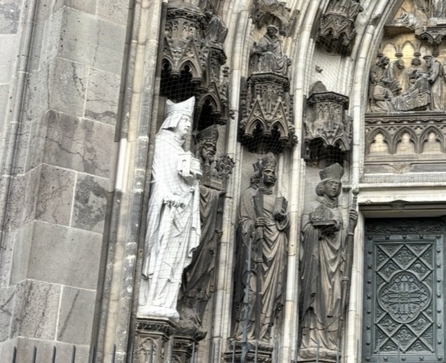 Zur geplanten Zeit eilte er mit dem Bollerwagen Richtung „Tatort“, nahm den morgens angemischten Betonkleber, der in einer von ihm eigens mit einem Motor versehenen Bingo-Maschine in der verarbeitungsbereiten Konsistenz gehalten wurde und kletterte auf einen Klapphocker. So erreichte er den leeren Sockel, auf dem eine Heiligenfigur fehlte, da diese gerade zur Restaurierung in der Werkstatt war. Aber für die wäre gleich keine Chance für eine Rückkehr an den angestammten Platz, denn Kunibert hatte da seine eigenen Vorstellungen und klebte ein Abbild von sich in Heiligenoptik dort fest.